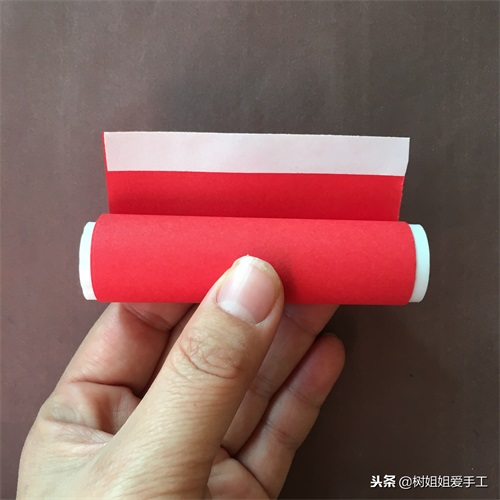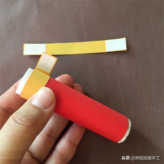 卷好纸管后,我们再剪出2条黄色的彩纸,首尾贴好双面胶,然后固定在红色纸管两头。