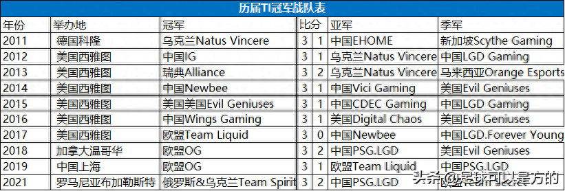 历届TI冠军战队分别是(TI1~TI10):乌克兰Natus Vincere、中国IG、瑞典Alliance、中国Newbee、美国美国Evil Geniuses、中国Wings Gaming、欧盟Team Liquid、欧盟OG、欧盟OG及俄罗斯&乌克兰Team Spirit。