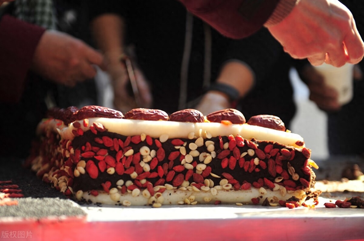 这切糕曾经是古代丝绸之路的重要干粮,它用了核桃仁,扁桃,腰果,葡萄干、蜂蜜等等,因为原料和制作成本比较高,也决定了切糕的价格不会太便宜,而经过舌尖二的播出,家族切糕第四代传人,为新疆切糕证明。让大家明白了,原来切糕是如此的平民化制作工艺、如此的考究,也不存在强买强卖的现象。