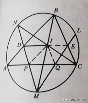 例1、已知:△ABC内接于⊙O,L、M和N分别为BC、CA和AB的中点,连结NM、LM分别交AB、BC于D、E,I为△ABC的内心。求证:D、I、E共线.