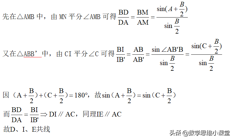 如果一时没有找到恰当的等量关系,或没有看出相似形,亦可借助分角线定理和正弦定理进行计算,即有