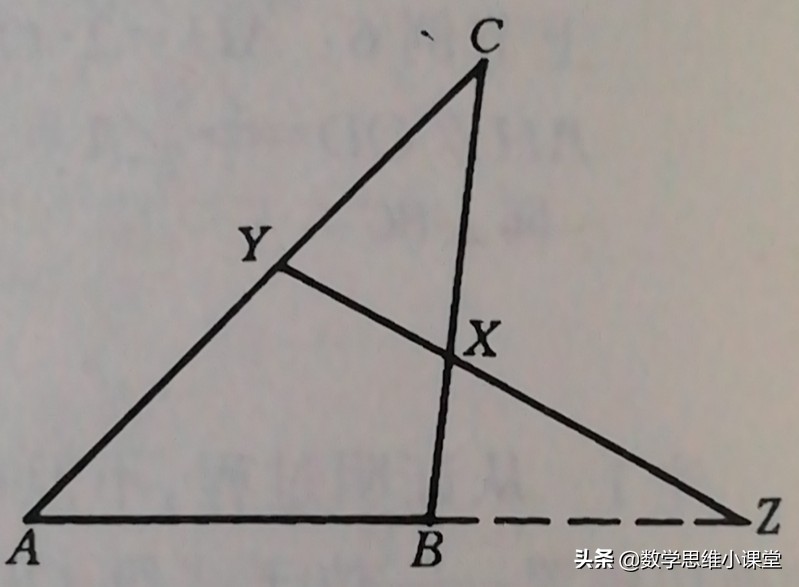 (1)梅氏准则:在△ABC中,设X,Y.Z分别位于BC.CA.AB或其延长线上,如图4.1。