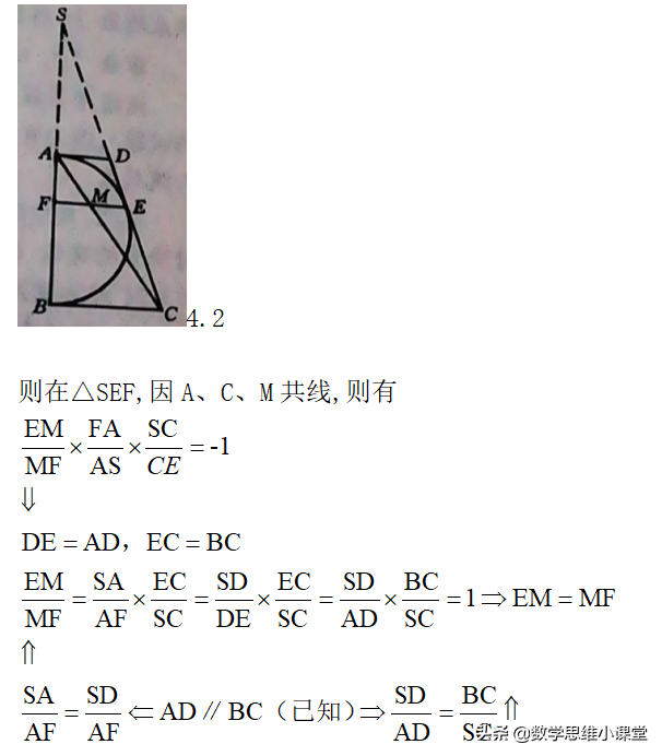 例2、在直角梯形ABCD中,以垂直的一腰AB为直径的半圆切另一腰于E,自E作EF⊥AB于F,连结AC交EF于M。求证:AC平分EF