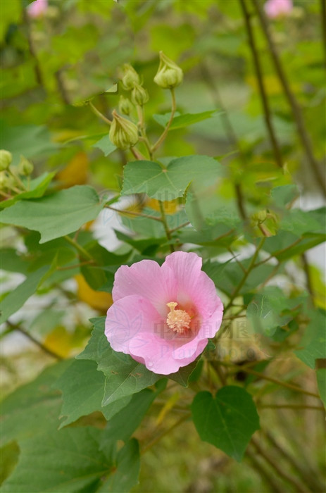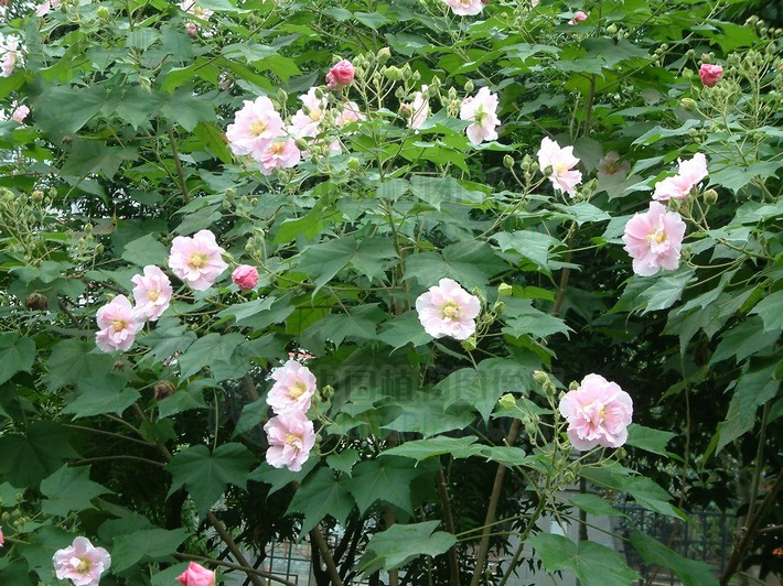 木芙蓉 落叶灌木或小乔木,高2-5m。小枝、叶柄、花梗和花萼均密被星状毛与直毛相混的细绵毛。叶互生;叶柄长5-20cm;托叶披针形,长6-8mm,常早落;叶宽卵形至卵圆形或心形,直径10-15cm,常5-7裂,裂片三角形,先端渐尖,具钝圆锯齿,上面疏被星状细毛和点,下面密披星状细绒毛;主脉7-11条。花单生于枝端叶腋间,花梗长约5-8mm,近端具节;小苞片8,线形,长10-16mm,宽约2mm,密被星状绵毛,基部合生;萼钟形;长2.5-3cm,裂片5,卵形,渐尖头;花初开时白色或淡红色,后变深红色,直径约8cm,花瓣近圆形,直径4-5cm,外面被毛,基部具髯毛;雄蕊柱长2.5-3cm,无毛;花柱5,疏被毛。蒴果扁球形,直径约2.5cm,被淡黄色刚毛和绵毛,果爿5。种子肾形,背面被长柔毛。花期8-10月。