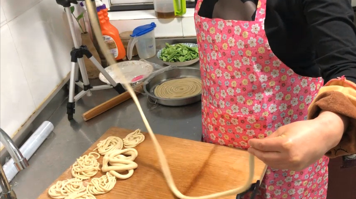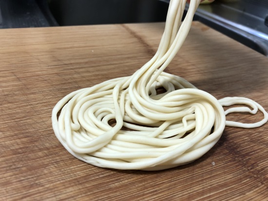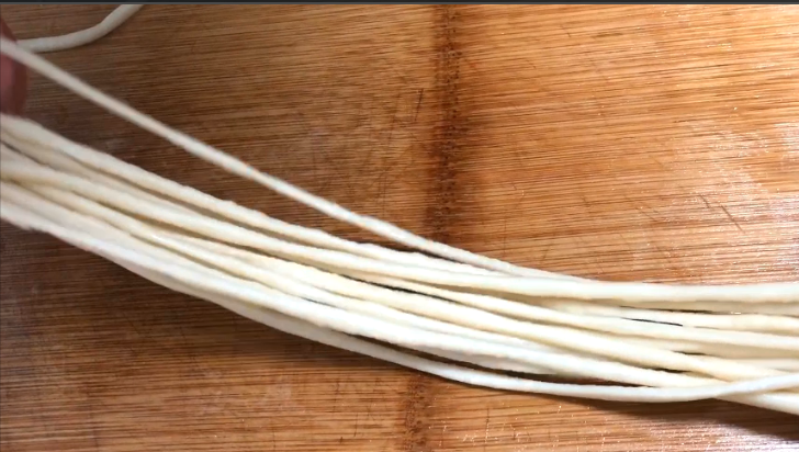然后就可以开始拉面啦,这时候的面已经很软,又很筋斗了,咱因为没有加任何的添加剂,所以做出来的拉面是非常的香的,