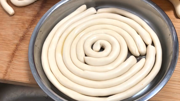 把面条搓成圆条,盘底刷油,盘入盘子里,上下都刷上油,