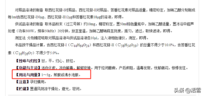 1、2020版中国药典里对藏红花的用法用量上是1-3g,比之前版本的建议用量更多了,这说明相关部门对藏红花的食用量,禁忌方便有放宽的趋势。