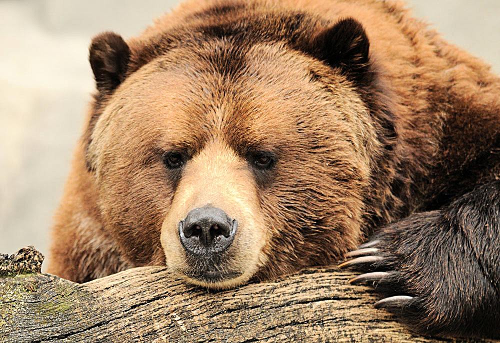 (趴着的灰熊。)