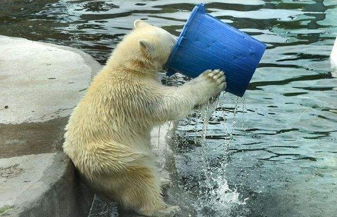 (莫斯科动物园的北极熊端桶喝水,憨态十足。)