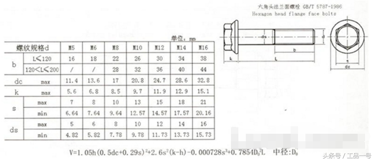 3、GB /T 5787-1986 六角头法兰面螺栓规格尺寸表