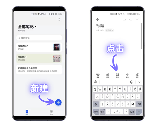 首先打开华为手机自带的备忘录,点击右下角的“+”号按钮,新建一个笔记本,在键盘上方有5个选项,我们点击「图片」按钮。