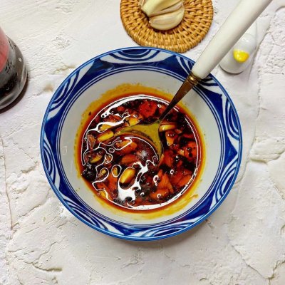 3、调一个灵魂料汁,碗中倒入2勺生抽,2勺香醋,2克白糖,1勺老干妈,蒜末,8克盐搅拌均匀; 我家做凉菜喜欢用山西手工老陈醋,陈醋是用粮食酿造而成,有香甜的味道,在颜色要偏暗一些,做出来的凉菜比米醋的味道更好,喜欢吃凉菜的可以备一些手工陈醋。