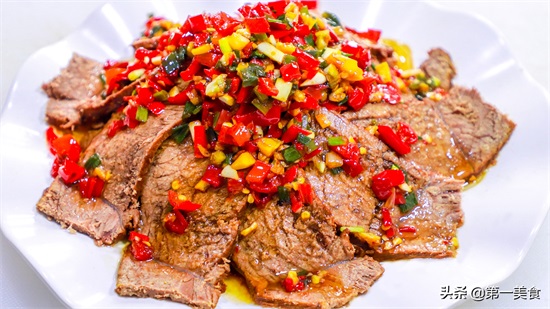 然后把切好的牛肉摆放在盘中,浇上调好的料汁即可上桌。