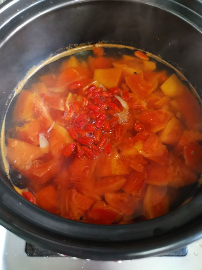 再放入切好的木瓜碎,根据个人口味放入红糖。