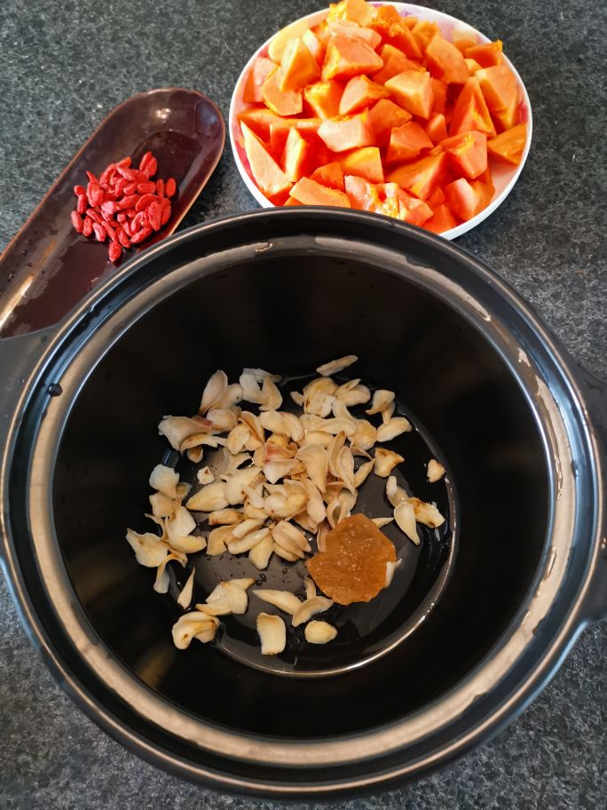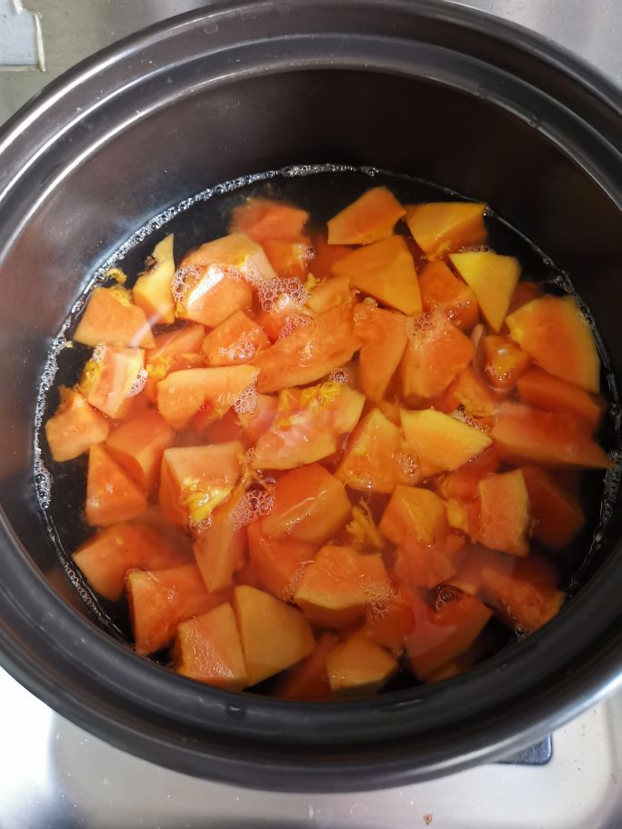 3、再放入切好的木瓜,大火烧开后,转中小火煮10分钟。
