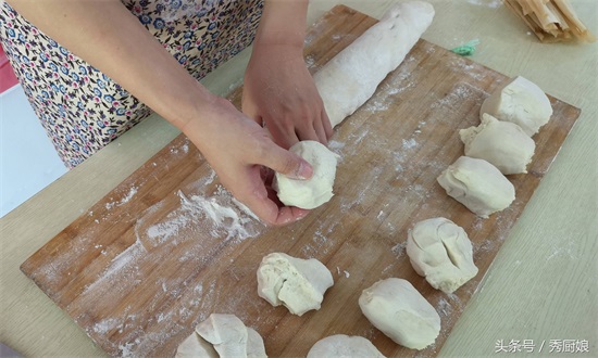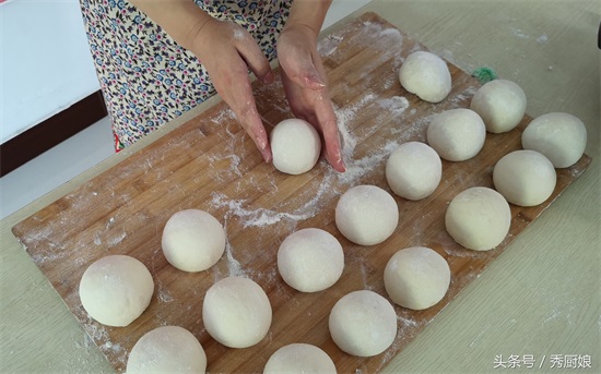 5.把面团揪成大小相等的面段,用右手手掌部位用力揉面,左右辅助,每揉一下,将面团转一下,揉至成圆形为止。