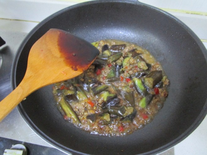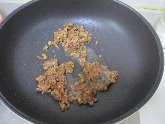 第五步:待收汁到差不多的时候加入炒好的肉末,加上一点老抽上色。