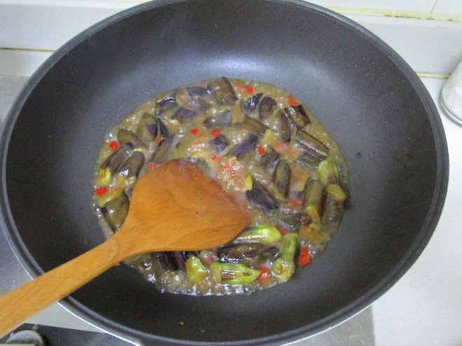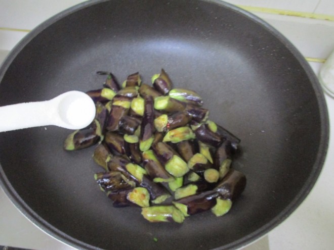第三步:再把茄子放入进去煸炒至变色后就可以加点盐调味炒匀。