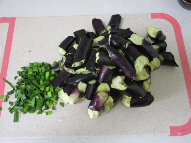 食材:茄子、猪肉、食用油、韭菜、盐、黄酒、生抽、老抽、剁椒。