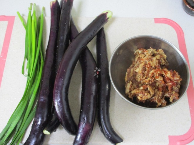 第一步:先把食材处理一下。茄子清洗干净后去头去尾;韭菜也清洗干净;猪肉清洗一下然后剁成肉末后放入一个碗中,加入黄酒和1勺生抽后均匀搅拌。