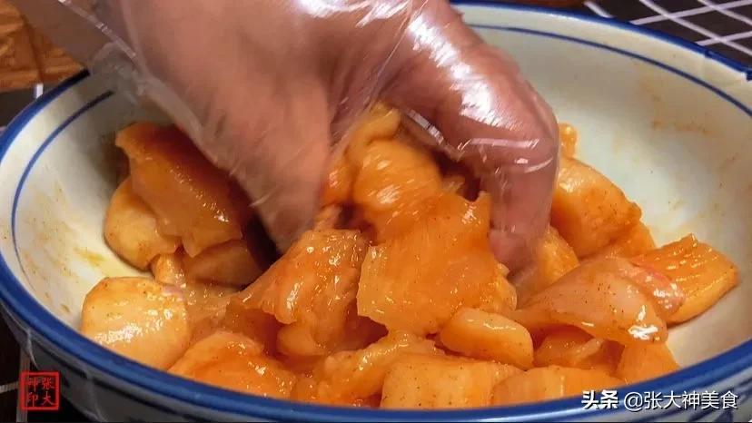 重点来了,切好的鸡肉中放盐,五香粉,胡椒粉,奥尔良腌料,蚝油,在用祖传的双手给他抓拌均匀,腌制30分钟