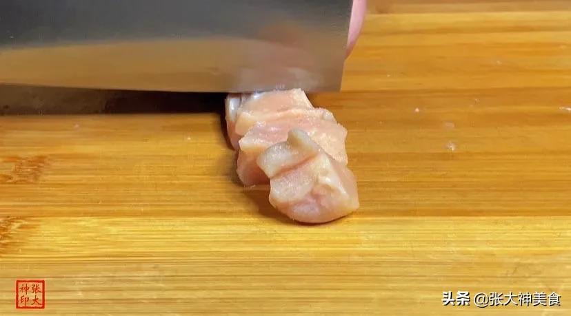 我们就以两块鸡胸肉为例,把他用刀子夸夸夸切成这样的小块,放在大碗里。