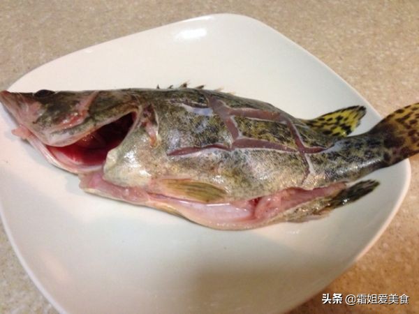 2.桂花鱼处理干净,鱼的两面切菱形花纹,横竖两刀就可以了,这样好入味,姜、葱切细丝