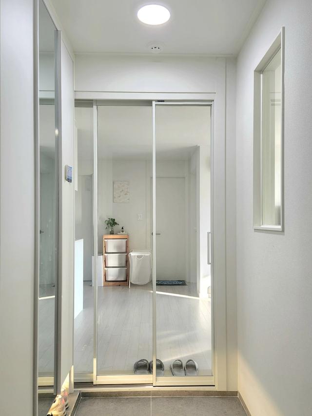独立的玄关设计,让进门处拥有了一个实用的“缓冲空间”。进屋左手边是一整排通顶鞋柜,收纳机能十分强大,右侧墙体开了一扇玻璃窗,隔开空间又能引进采光。