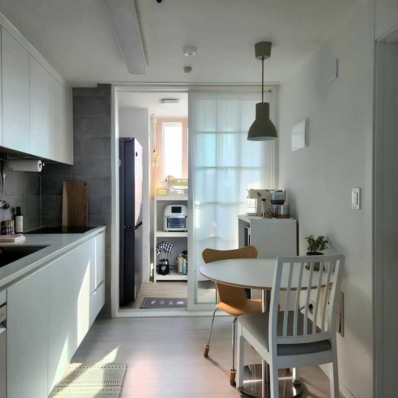 俗话说金厨银卫,厨房最是能反映一个家是否干净的区域。由于面积小,所以设计了餐厨一体化的结构,能确保空间更大的利用率。