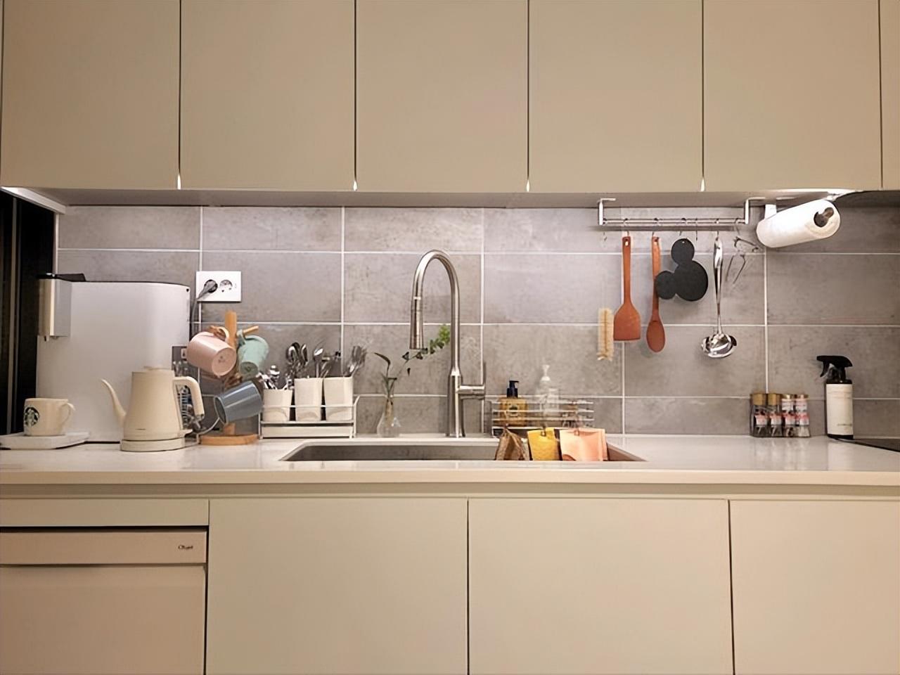 橱柜虽然是极简的设计,台面和柜门都是纯白色,但恰是这种干净利落的感觉,带来了些许高级感,不仅好打扫还特别耐看。