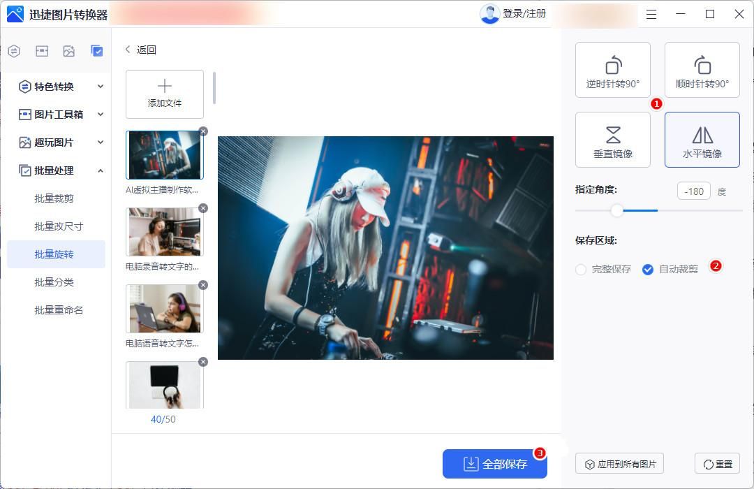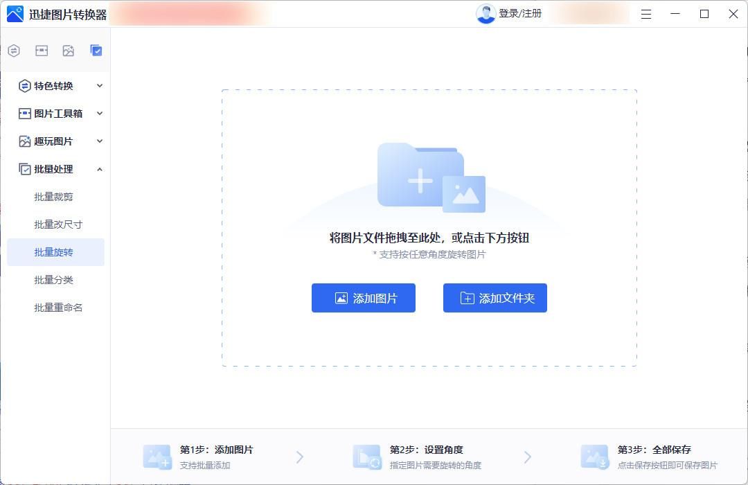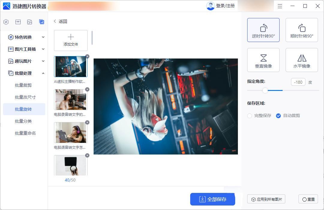 迅捷图片转换器你一看它软件名,就知道它主打功能就是处理图片啦。它不仅支持图片的多种格式无损互转,还拥有多种处理图片工具,例如抠图换背景、图片去/加水印、马赛克笔等,并且还可以批量处理图片,例如批量裁剪、批量改尺寸、批量重命名等,你想要将图片批量旋转的需求更是小意思。