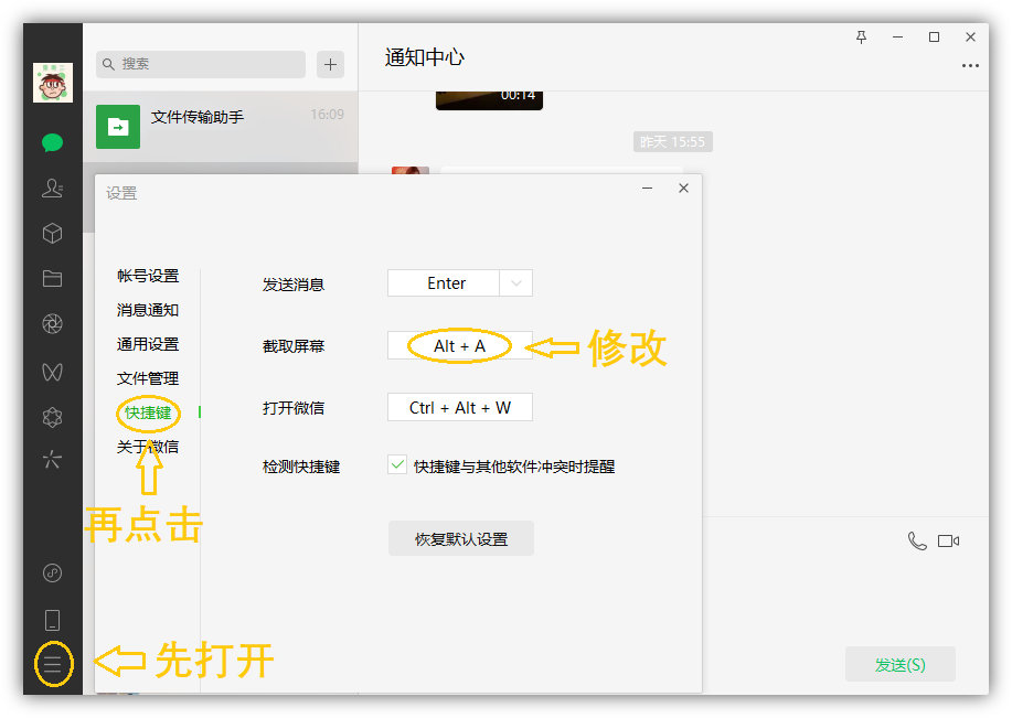 微信电脑截屏键ctrl加什么(微信电脑版常用快捷键介绍) 电脑版微信怎么截屏 总结一下子:(1、进入微信后,按键盘Alt+A键即可截屏。2、点击左下角的三条杠。3、接着点击设置选项...