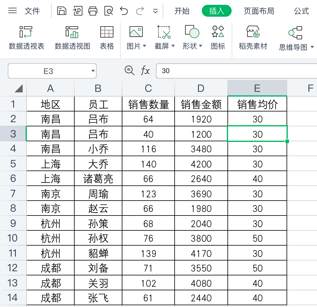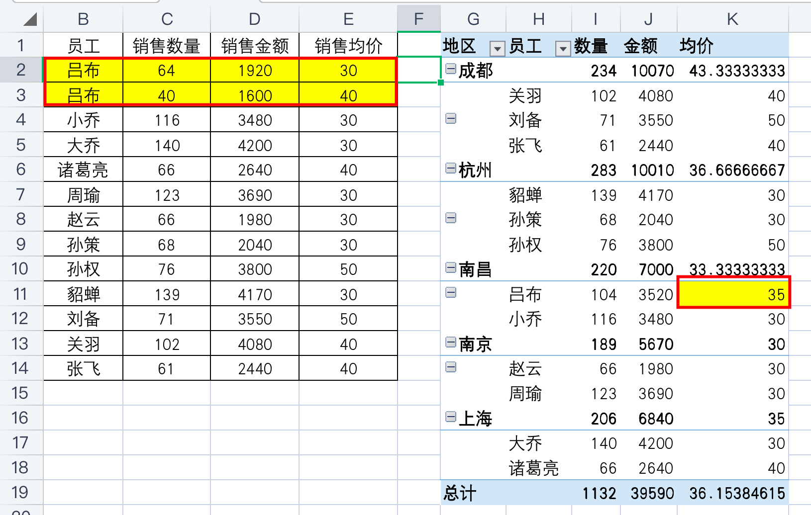 但凡我们原始数据中两条数据均价不一样的情况下,比如说:吕布一次是30均价销售的,一次是40均价销售的,那么如果只是求平均值,Excel只会简单的把所有均价进行求和再除以数量,所以Excel是用(30+40)/2=35得到的均价;