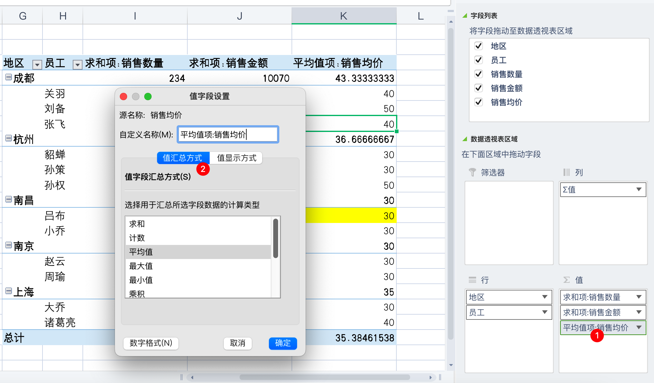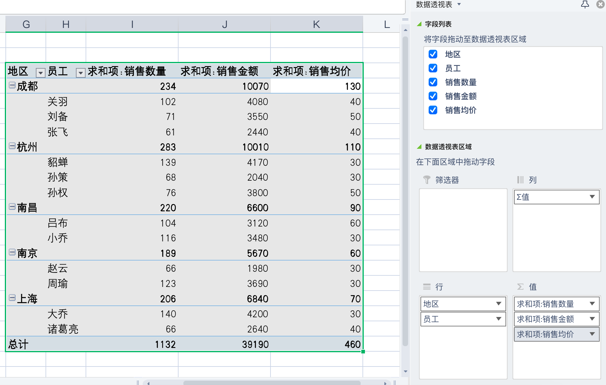 然后将地区和员工放在行标签,将数量,金额,均价字段放在值里面,得到的结果如下