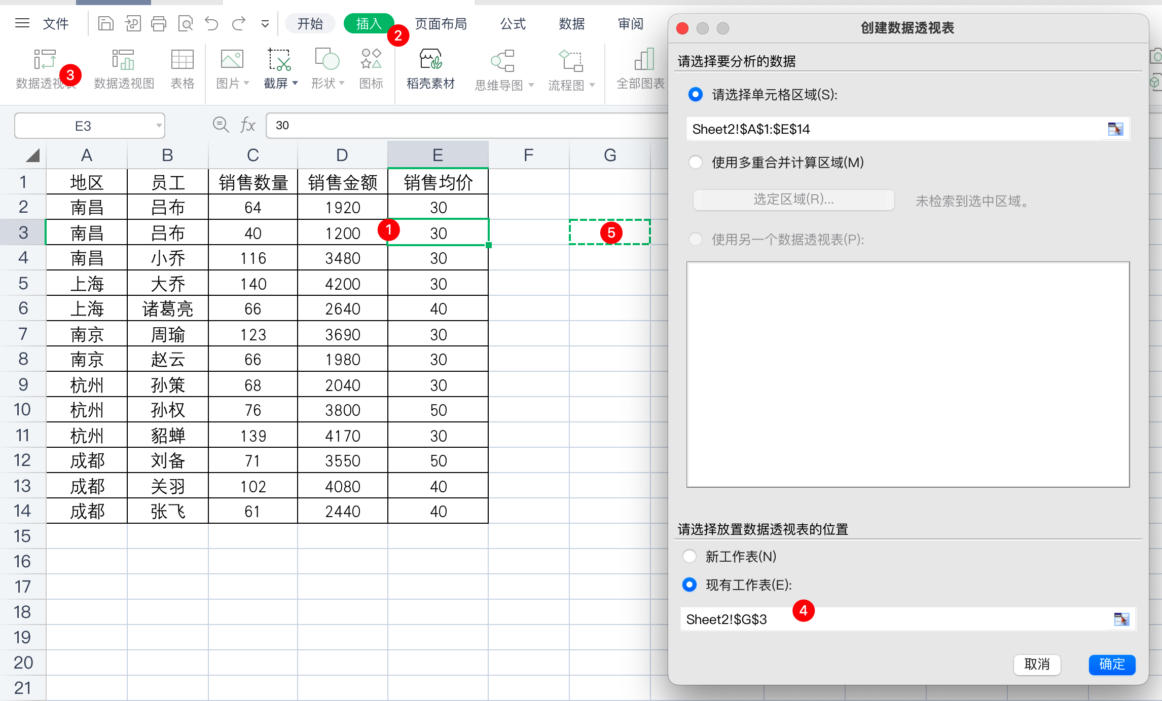 我们可以选中数据区域内的任意一个单元格,然后点击插入,选择数据透视表,放在G3单元格,如下所示: