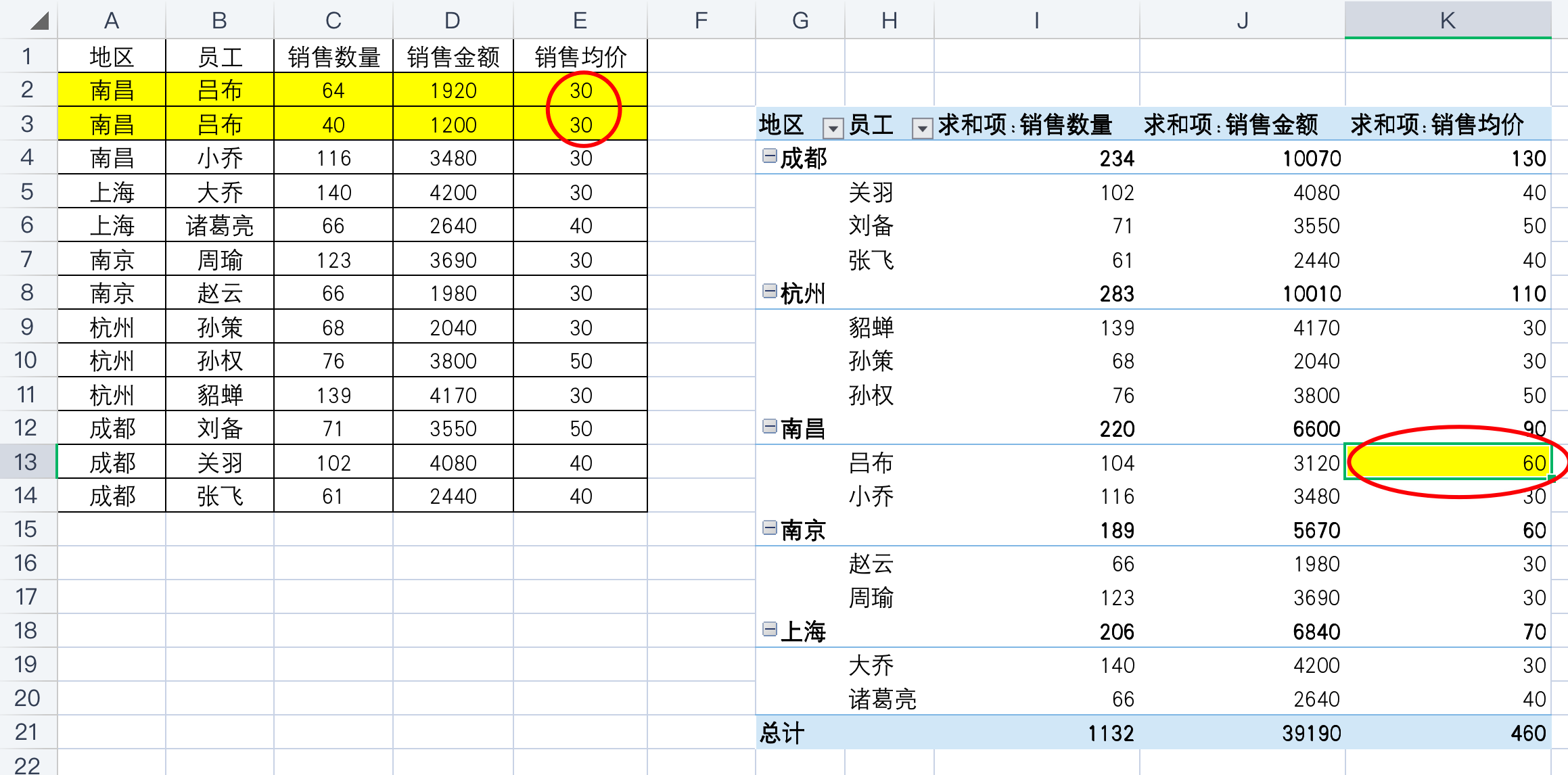 但是这样的设置是有前提的,就是原始数据表格中,员工每次销售的均价是一样的情况下才可以这么汇总的。