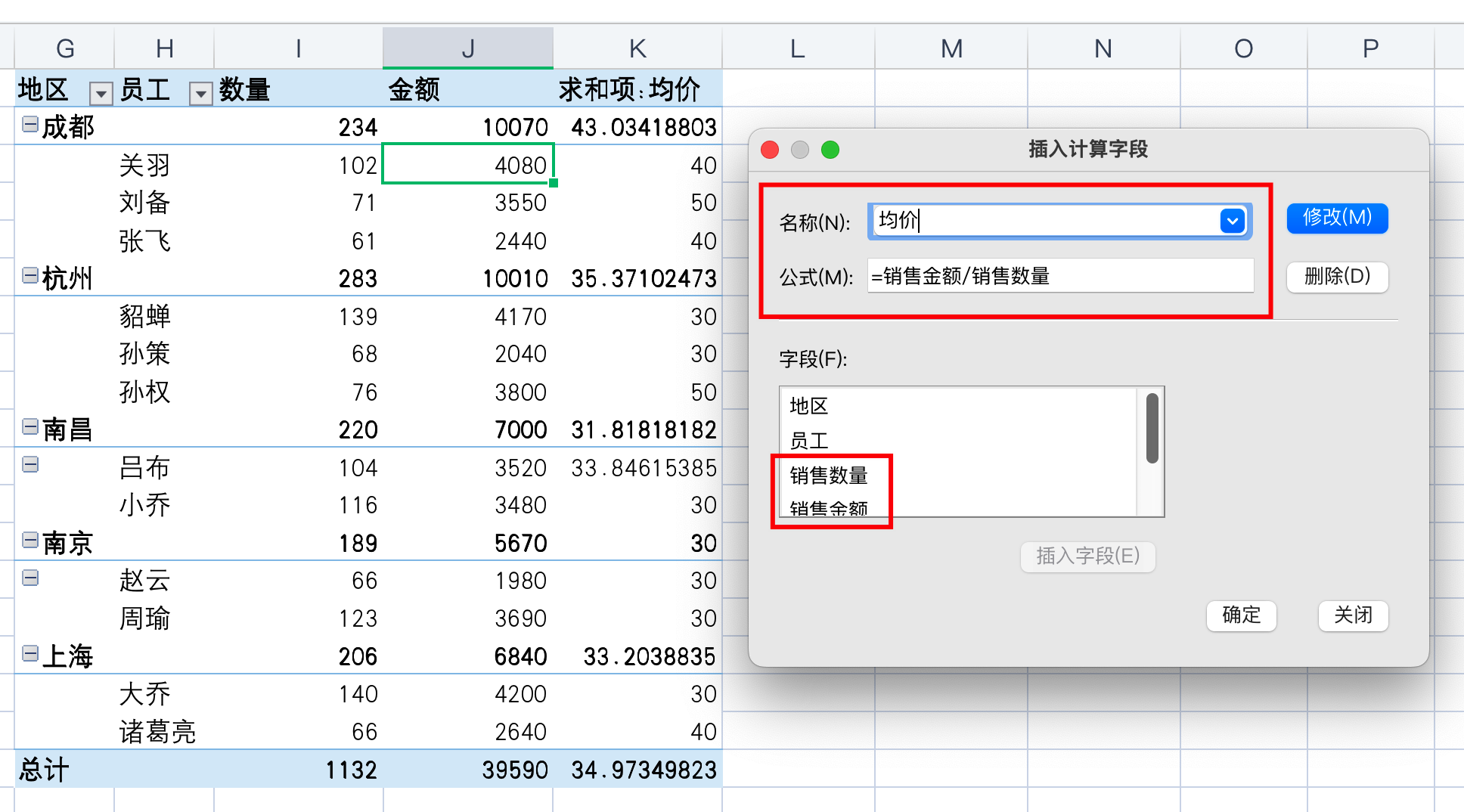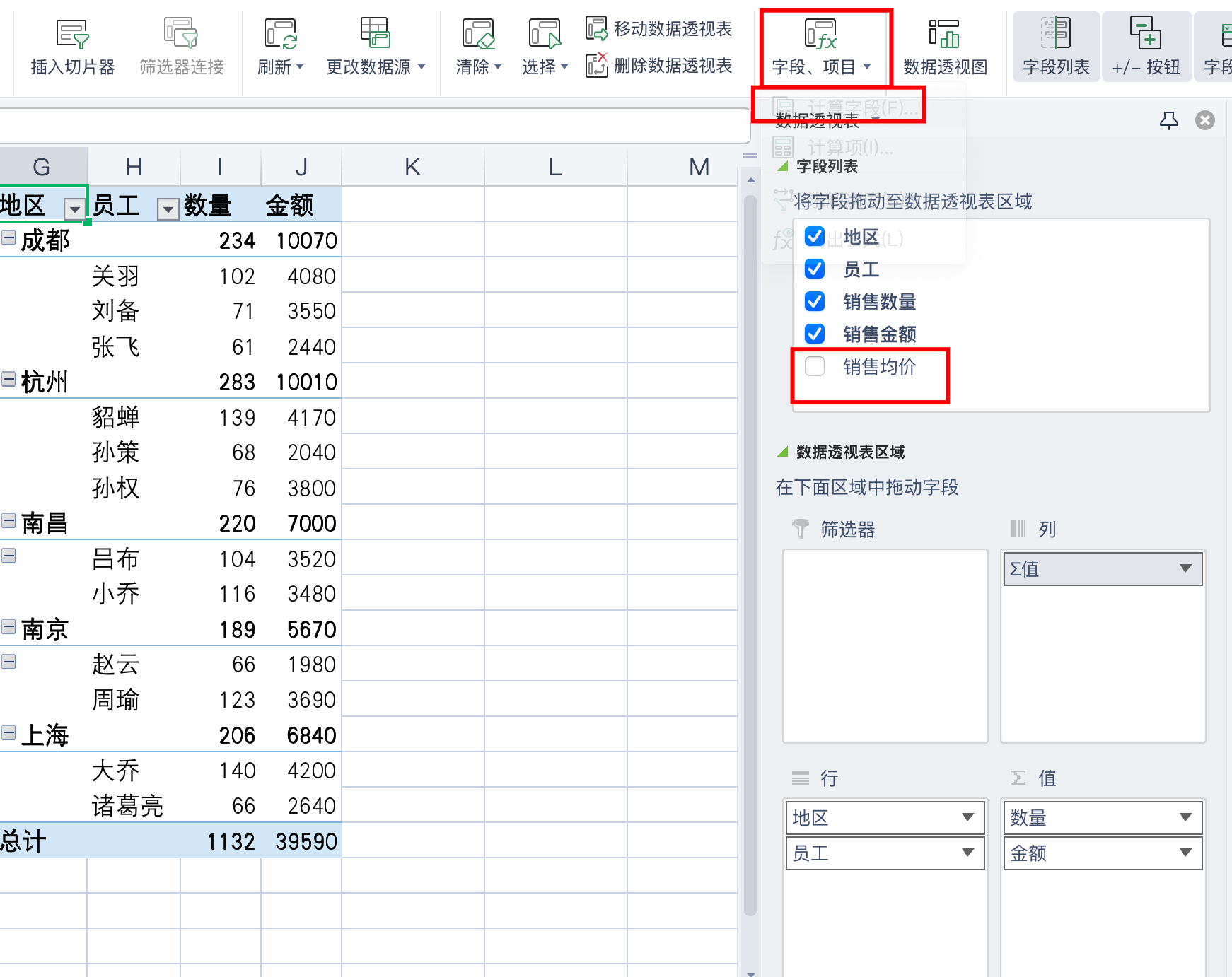 所以遇到这种数量汇总之后再相除的时候,我们需要取消原始表格中的均价字段,使用字段/项目上方的,计算字段来完成