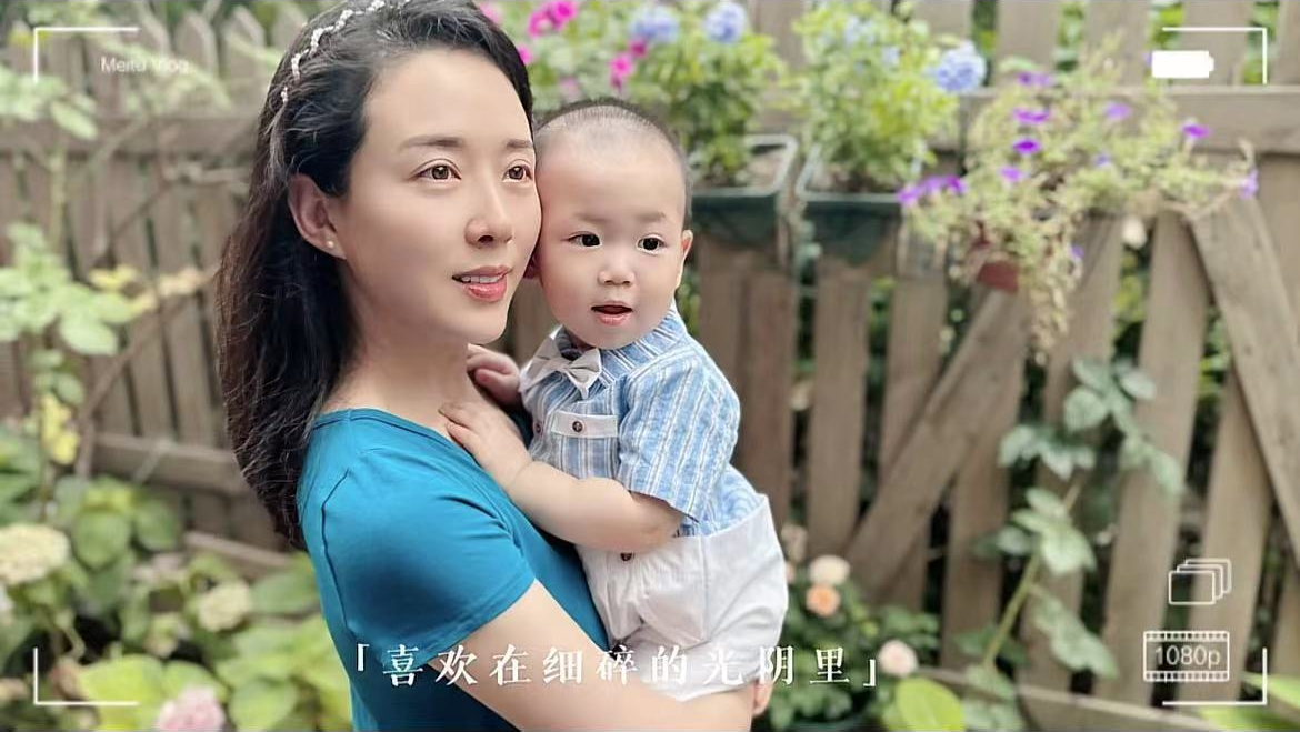 从画面来看,一家四口站在家中的院落里,四周都是花花草草,看得人心旷神怡。