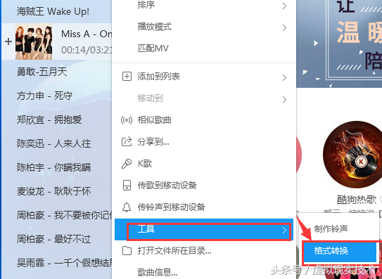 第一步,右键歌曲,点击工具里的格式转换,如图: