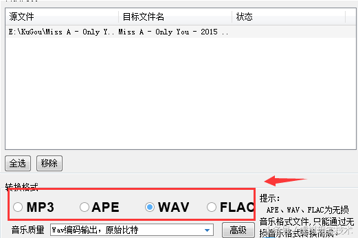 第三步,添加歌曲进去之后,里面可以选择MP3、APE、WAV、FLAC的转换格式,转换设置就是转换保存的位置,步骤如图: