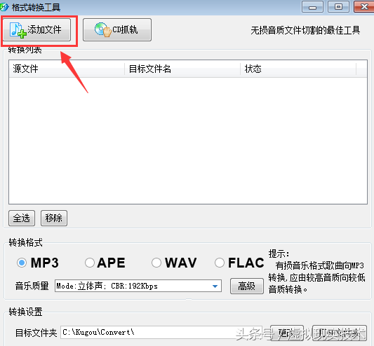 第二步,弹出格式转换工具,点击添加文件,添加想要转换格式的歌曲。步骤如图: