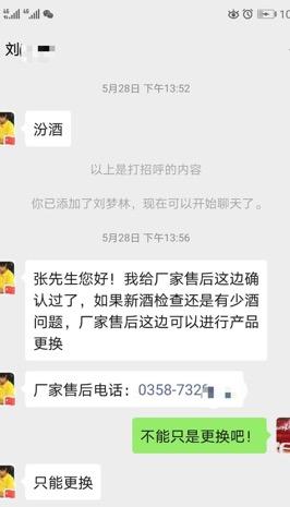 张先生立即向京东客服投诉。过了10天,一名北京中恒实信贸易有限公司的人加了张先生微信,自称是京东供货商,称可以安排人上门,如果新酒确实缺少分量,售后可进行产品更换。可张先生认为,酒没拆封就少了,难到不是缺斤短两欺诈消费者吗?