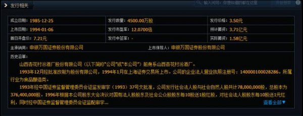 山西汾酒上市第一年涨幅仅11.43%,比同年上市的泸州老窖要差很多。为什么山西汾酒上市第一年表现这么拉跨呢?主要是因为赶上了大级别的下跌。1994年是令大部分人绝望的一年,指数一度从1500多点下跌到300多点,后来在出台一系列救市政策之后,才扭转颓势,最终触底回升,但全年跌幅依旧高达22.3%。山西汾酒就是在这样一个大的背景下上市,表现不佳也情有可原。