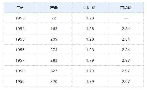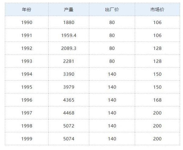 从建厂到80年代,茅台由国家定价,价格几十年几乎不变,最初的出厂价1.28元到2.5元,经历了20年。(下面,产量以吨为单位,出厂价、市场价以元为单位)