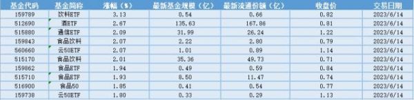 6月14日场内ETF基金涨幅中,饮料ETF(159789),涨幅3.13%。酒ETF(512690)、通信ETF(515880)、食品饮料(159843)等食品饮料ETF排名靠前。6月14日行业板块中,港股大盘相关的指数ETF成交额较大,恒生互联(513330)以28.87亿元位居首位,板块跌幅0.92%。疫情影响逐渐减弱,关注消费复苏进展。当前疫情对于线下出行的影响逐渐减弱,线下消费场景渐次恢复、企业推进复工复产,23年以来我国社零总额月度同比增幅逐步扩大,疫后消费复苏为推动食品饮料板块行情的主线。经济温和复苏下,偏刚性需求的高端酒、乳制品相对受益。建议下半年需密切关注消费复苏进展,食品饮料ETF大涨。