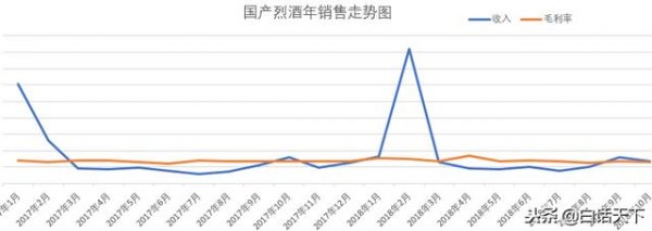从年的销售走势图来看,非常有个性,跟散装糖果一样,平时销售比较平,只有春节月非常的高,最低月份是7月,也就是说,白酒在天气比较热的情况下销售比较差很正常。春节月是最低月份10倍以上,其次销售比平时略高的月份是中秋节月,是最低月份的3倍左右。