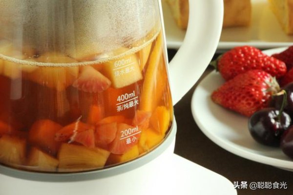 第二步:在壶中放入喜欢的水果,煮果茶可以用任意水果,但是味道要清爽一些的额,例如芒果,菠萝,柠檬,西柚,草莓等,不适合用榴莲或者香蕉,有异味而且煮好的果茶会浑浊。