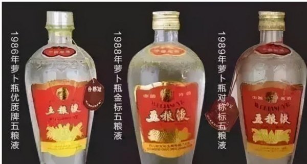 收藏市场上较为常见的五粮液,主要为萝卜瓶型,其中塑盖的五粮液生产时间较铝旋盖生产时间更早,价格也高出不少。七十年代的“长江大桥牌”五粮液具有较为鲜明的时代特性,这种商标的老五粮液酒于二十世纪八十年代逐渐隐退国内市场,取而代之的是“交杯牌”和带有中国名酒优质奖章的五粮液酒“交杯牌”注册商标于1981年开始使用,该注册商标有“推杯换盏,把酒言欢”之寓意,该商标直至1986 年方才退市;带有优质奖章的五粮液酒则是其在1979年获得“中国名酒”称号后开始生产。