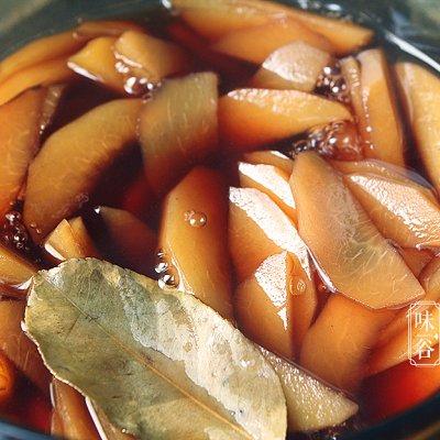 6、晾凉后连同红酒一起放入,让红酒浸泡桃肉,冰箱冷藏一个小时左右就可以开吃啦,浸泡的时间越长,桃肉的颜色越发变深;炖过桃子有浓浓的酒香和果香,吃起来味道相当不错!