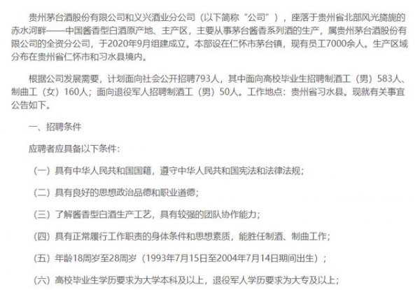 今日(7月4日),《每日经济新闻》记者从贵州茅台官网获悉,公司从事系列酒生产的和义兴酒业分公司面向社会公开招聘管理、生产等人员共800余人。其中,面向高校毕业生招聘制酒工(男)583人、制曲工(女)160人;面向退役军人招聘制酒工(男)50人;面向社会公开招聘管理、生产人员80人。